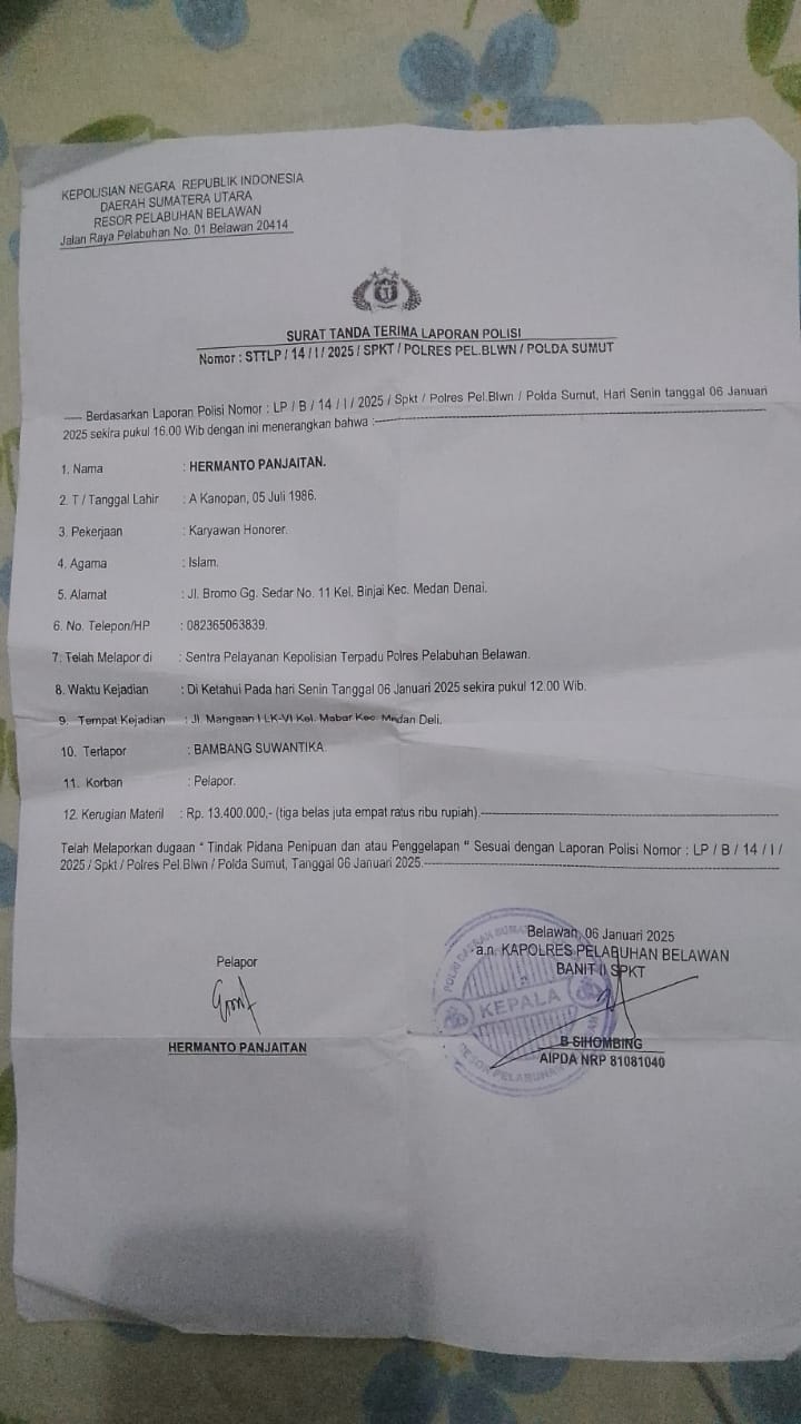 Merasa telah ditipu dan dirugikan, tepat tanggal 6 Januari 2025 lalu, Hermanto melaporkan Bambang Suwantika ke Polres Pelabuhan Belawan atas kasus penipuan dan penggelapan, sesuai dengan Nomor: STLP/14/I/2025/SPKT/Polres Pel.Belawan/Polda Sumut.